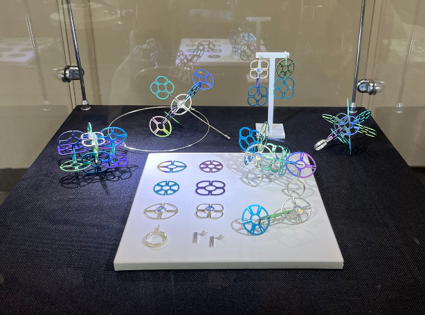 組裝一個造型通常需要較多的模塊才能獲得立體豐富的效果,所以設計師選擇了鈦金屬,這種同等體積下質量較輕的金屬,并用陽極氧化工藝上色,增強模塊化首飾趣味性的表達。成品包含戒指、耳環、項圈配件與四種形態的金屬雪花片,供佩戴者把玩、組合。