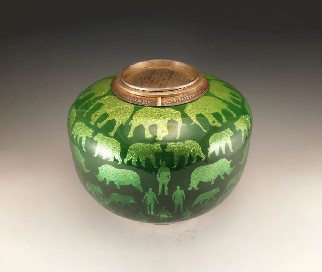 作為一名從事金屬和琺瑯創作并創作俳句詩的藝術家,我創作的器皿反映了主題、顏色、紋理以及自然世界的美麗、嚴肅和神秘。地球、它的植物和動物、地理和景觀,激勵我創作并嘗試傳達一些在荒野中的情感反應。我的《滅絕船只》對人類造成的地球上野生動物的消失進行了評論。我的“環境容器”評論了我們如何與地球互動。我也對我們在整個歷史中告訴自己的故事感興趣,試圖賦予我們的旅程意義。