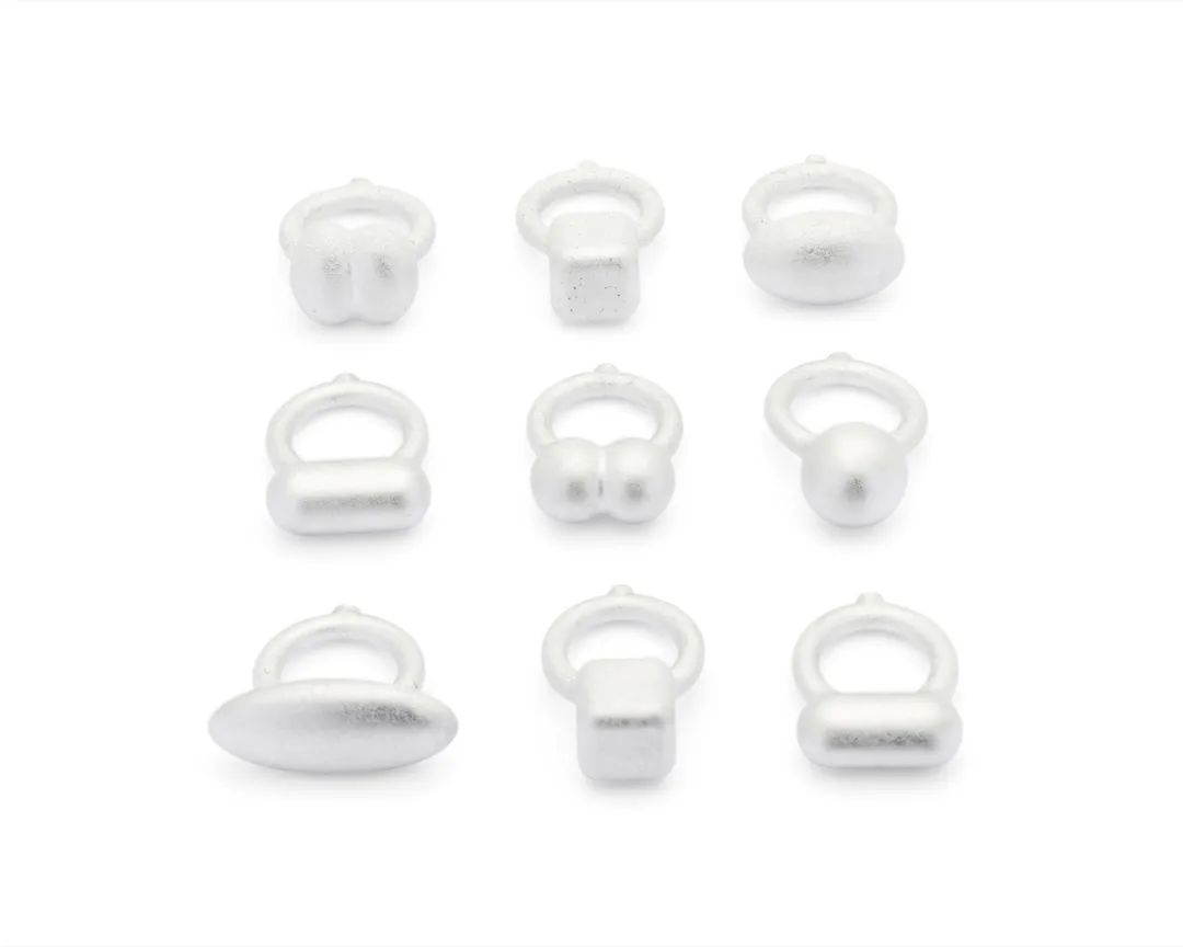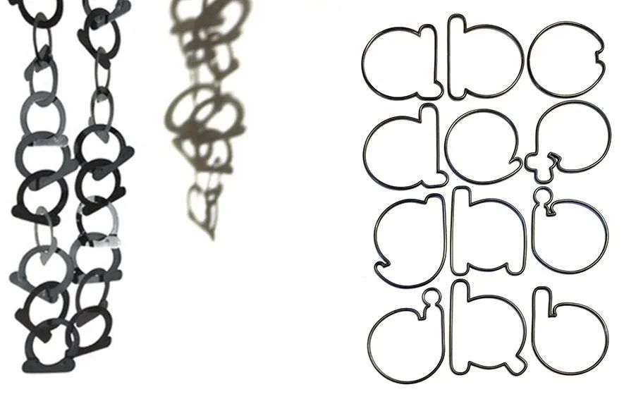 Roseanne 的最新作品將字母表視為一種觸覺系統(tǒng)。她測試了字體設(shè)計的解剖結(jié)構(gòu),以響應(yīng)裝飾的具體條件。該項目將基于字體的探究擴展到珠寶領(lǐng)域,包括字母項鏈、耳環(huán)、手鐲和戒指。每件珠寶都為字形字符和佩戴者的身體之間的互動創(chuàng)造了機會。