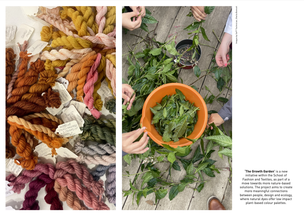 循環設計工坊 :校內“植物染料花園”與伯明翰植物園合作,實現從茜草種植到廢棄織物酶解的全流程實踐,學生作品進入Pentatonic的"材料銀行"商用系統。