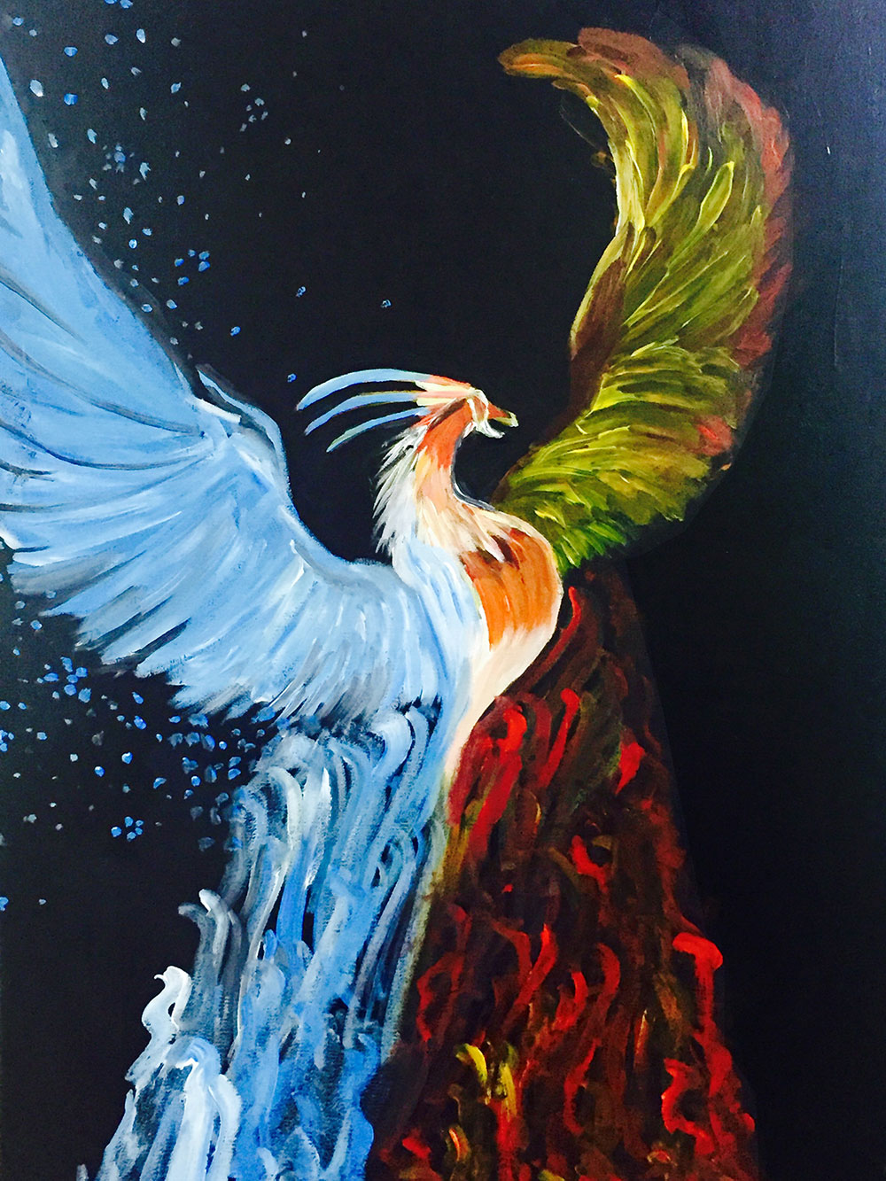 對,這是一個學校的參展活動,會選出一些比較優秀的學生一起參加展覽,因為我的作品比較多,涉及到服裝、繪畫、珠寶,最后時商場選擇了一副鳳凰的丙烯原料的畫和一些珠寶設計。