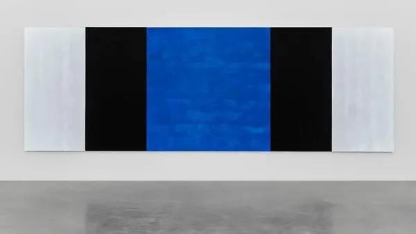 瑪麗·闊思,無題(白,黑,藍,斜截邊),布面玻璃微粒及丙烯,198.1×594.4×10.2cm,2019 ©瑪麗·闊思,由凱吉克畫廊及佩斯畫廊提供