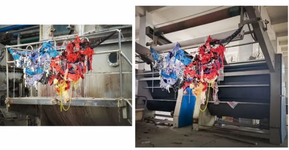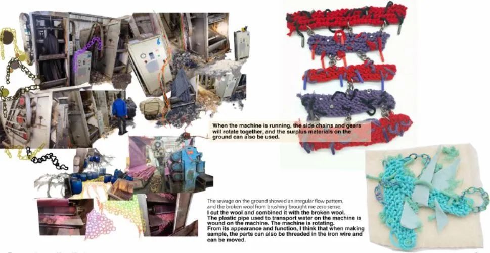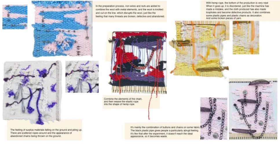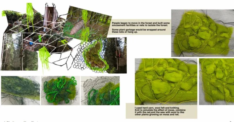 我用塑料材質(zhì)(塑料管、泡泡紙)、金素材質(zhì)和網(wǎng)狀材料來(lái)代表污染物,給他們?nèi)旧靡恍┟€、碎布、紗線、毛氈來(lái)表現(xiàn)植物的質(zhì)感,將這兩種反差很大的材質(zhì)通過(guò)編織、縫線等等的方式結(jié)合到一起,來(lái)體現(xiàn)我的主題,污染和自然環(huán)境互相滲透。