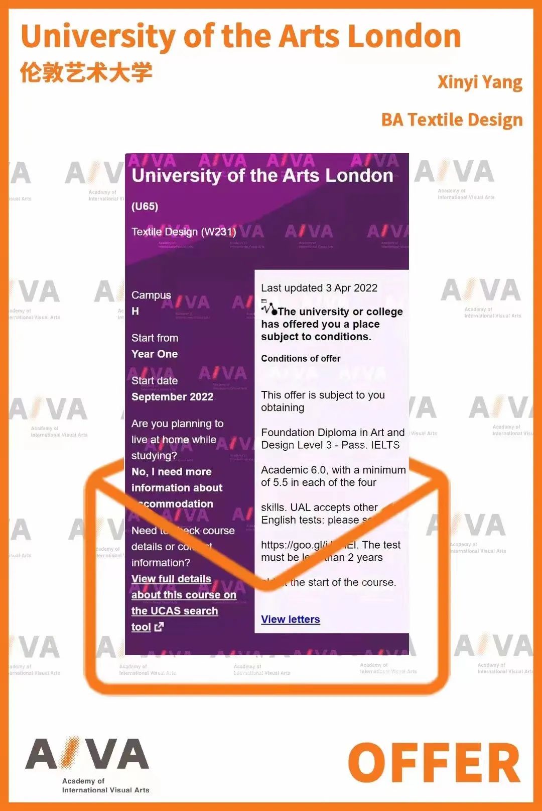 上周四,AIVA本科預(yù)科服裝專(zhuān)業(yè)學(xué)生Xinyi參加了UAL線上面試,順利拿到了切爾西王牌專(zhuān)業(yè)——紡織設(shè)計(jì)的offer,讓AIVA所有老師都倍感激動(dòng)!而更多的offer還在飛來(lái)中~