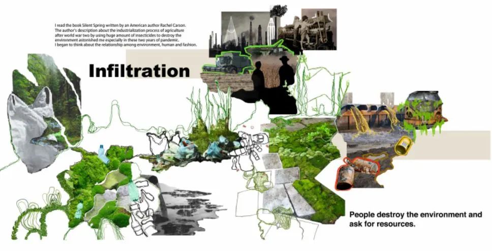 我最喜歡的項(xiàng)目是Infiltration滲透。這個(gè)項(xiàng)目主要反映的是人類(lèi)造成的污染,一步步滲透進(jìn)森林,滲透進(jìn)土地和植物的一個(gè)過(guò)程。