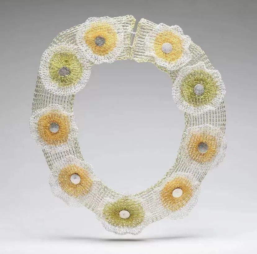 紐約藝術家Arline Fisch在振興珠寶作為一種當代藝術形式方面發揮了核心作用。她的杰出貢獻是將編織技術引入珠寶制作領域。她使用扁平的金銀線、編織、編結,運用靈活的編織手法、致密反光的圖案、微妙的質感和鮮艷的色彩將編織和鉤針編織的輕巧和靈動展現地淋漓盡致。