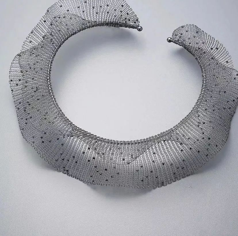 相比于傳統的紡織編織工藝,金屬首飾制作流程差異大,因此需要提前考慮好焊接、澆鑄處理~ 但是金屬編織也有顯著優勢,即金屬材料硬度高可塑性強,造型設計靈活,可以展示出材料的多樣性,體現出金屬編織藝術首飾的特點。
