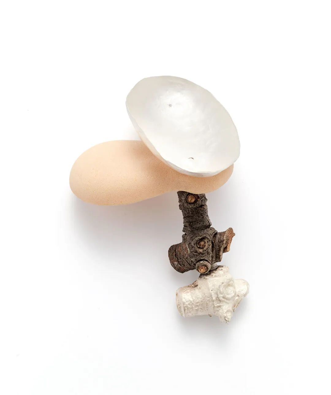 Gold plated brass, stone clay, polymer clay, acrylic paint