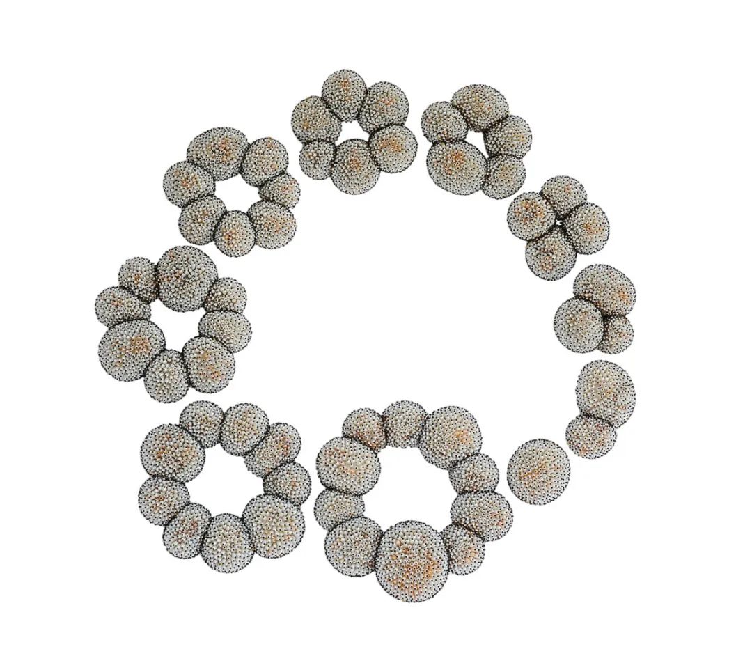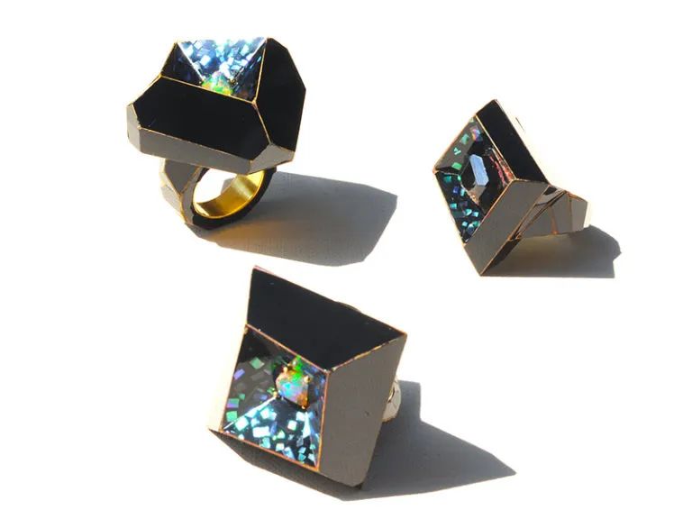 本次展覽包括戒指、項鏈和胸針,以及用于存放部分作品的手繪古董木制米盒。這些出色的作品靈感來自于藝術家Kageyama(影山)位于東京郊外富士山附近居所周圍的自然環境,在那里他可以清楚地看到夜空。為了制作這些令人眼花繚亂的作品,金匠大師影山使用了具有 300 年歷史的大漆碎片,這些大漆由大漆樹的有毒樹液制成。通過結合其他天然材料,如珍珠母、純金、朱砂和璀璨的巴洛克珍珠,以喚起黑洞、太陽和月亮等星系體的聯想。對于“黑洞”胸針,影山著眼于古埃及人對天文學的研究及其與金字塔的關聯。
