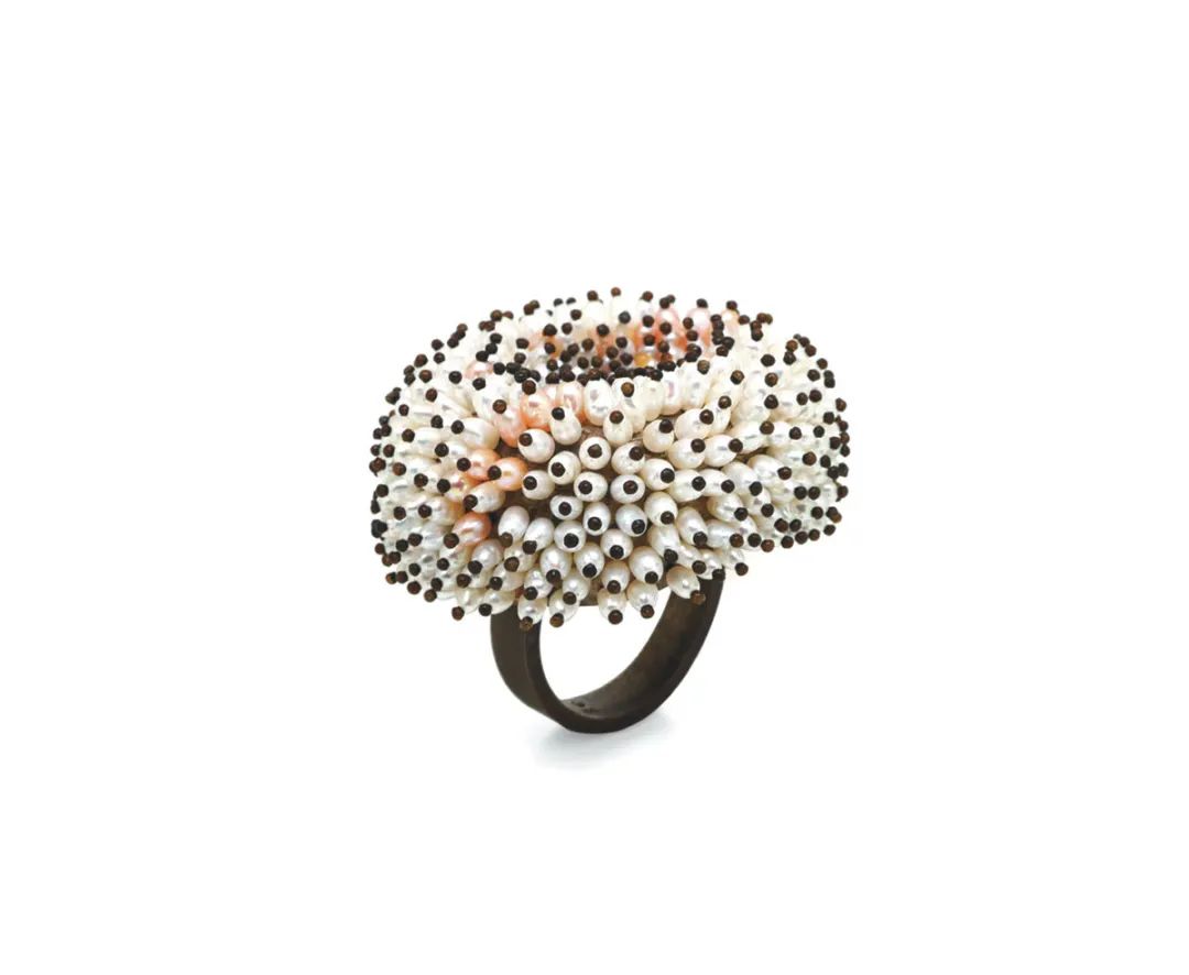 Minegishi制作的首飾和物品不僅需要佩戴,還需要撫摸。他通常將大塊天然材料(如烏木、琥珀、水晶、黑玉、日本木材和 lignum vitae)雕刻成環,呈現出感性的漩渦、扭曲的平面或類似乳房的半球——這些具有觸感的物體體現了護身符的力量。每一個角度都展現出獨特視角,每一件作品都達到完美的平衡。Minegishi的作品尺寸雖小,卻展現出了雕塑造型的不朽。