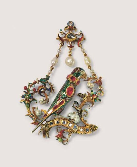 這件造型結構非常復雜的吊墜,以那一時期常見的卷曲的植物枝干效果為造型,使用彩色寶石與彩色琺瑯來達到創作上的和諧。該吊墜的制作時期雖然為藝術史上的風格主義時期,但是首飾的制作風格變化遠不如繪畫或者雕塑來的迅捷,因此在這件吊墜上我們依然可以感受到文藝復興時期對于和諧之美的追求。從穩定且對稱的基礎造型,寶石與琺瑯交錯創造的濃烈色彩對比,中性圍繞式的布局構建,無不展示了當時工匠精湛能力。部分也歸功于當時已經形成了具有學校制度與體系的專業的手工藝培訓工作室。