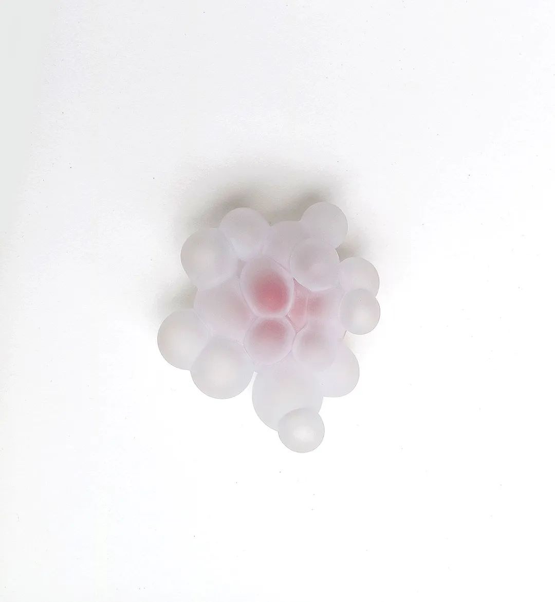與傳統珠寶作品中寶石與構成結構支撐的貴金屬相輔相成不同,這些作品中,寶石以薄片的形式被分層重疊,形成對比鮮明的不透明部分,然后使用彩色樹脂將它們連接在一起,制作成為整個胸針。