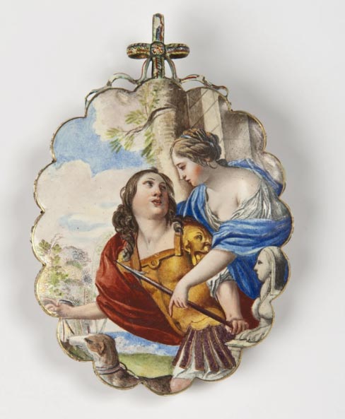 這件《殉道者圣凱瑟琳》的吊墜,制作于巴洛克時(shí)期早期。我們可以看到作者細(xì)致地繪畫出了持劍的圣凱瑟琳的人物形象,以及所在的場景細(xì)節(jié)。并且在圖像外圈,伴有小塊不透明彩色琺瑯圖形作為點(diǎn)綴。人物的衣服上,通過繪畫琺瑯的技巧與顏色組合,創(chuàng)造了衣服褶皺的立體效果與畫面景深關(guān)系。這一時(shí)期,作品的制作比較注重整體的感覺,而不是過去嚴(yán)苛地追求細(xì)節(jié)。