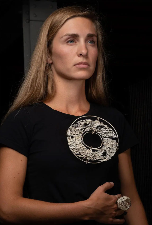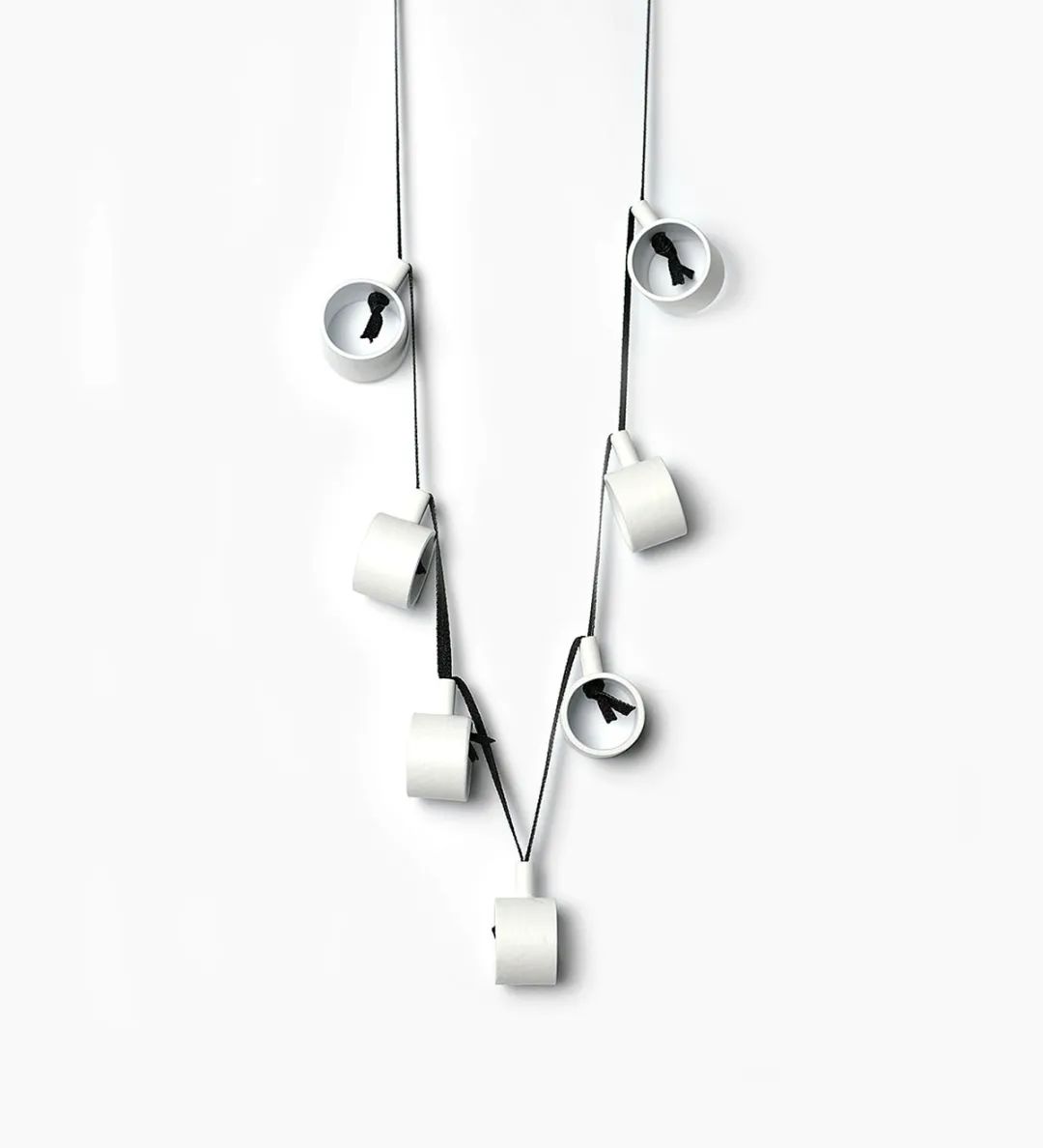 荷蘭首飾藝術家 Annelies Planteydt 的作品通過線條、填充、形狀來反映日常生活的組織或結構。這些作品可以在不同的階段進行觀看——首先是一幅幾何形狀的繪畫。第二階段發生在拿起它時,從表面觀察并以半流體形式塌陷時,繪畫的順序被打亂了,但運動中有一個美麗的新形態。第三,被佩戴時,佩戴者可以重新定位項鏈和結構 - 繪圖階段引用的細節是模糊的,但永遠不會消失在視線或腦海中。