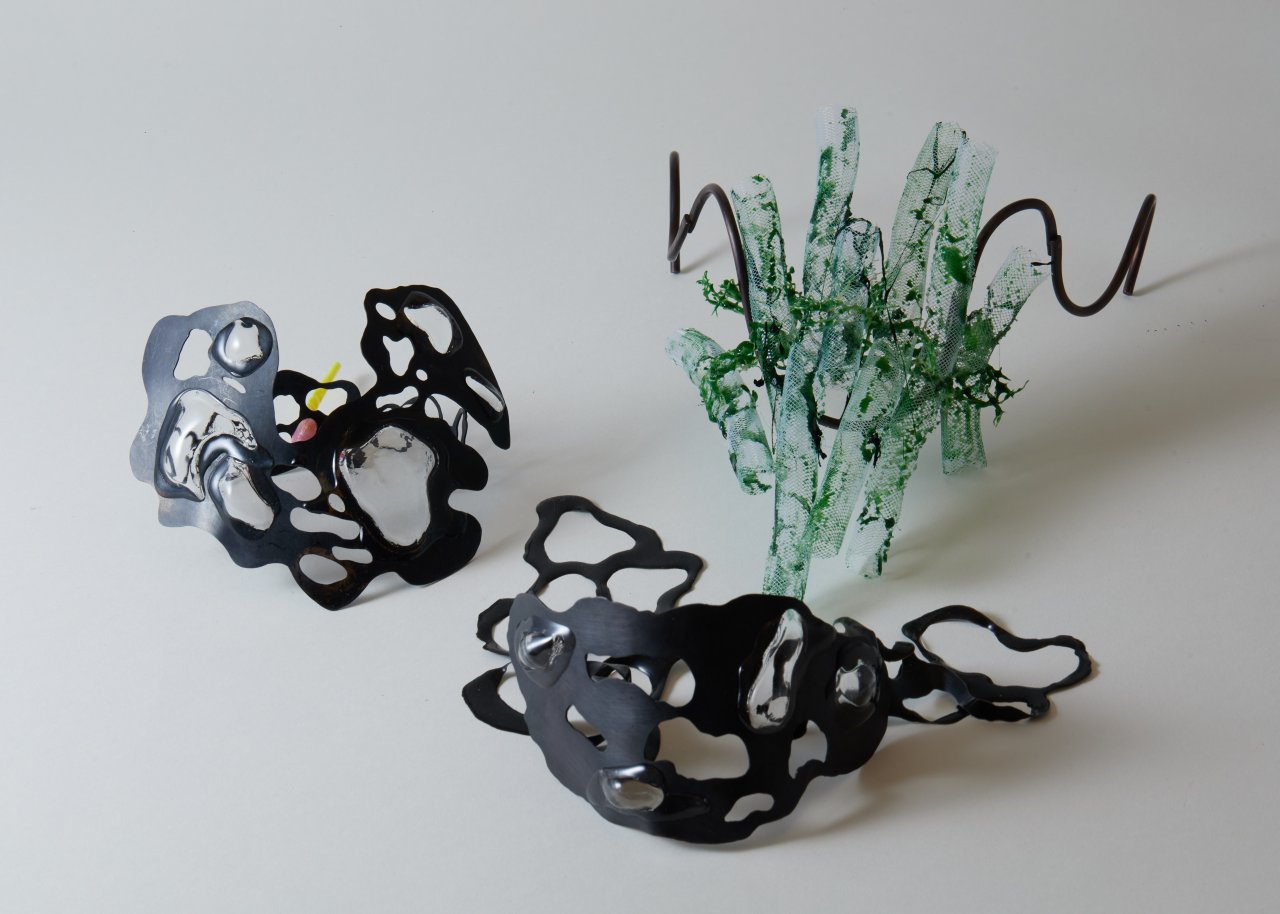 In my work <Suffocation>, I was inspired by the fact that man-made factors contribute significantly to the lack of oxygen in manatees due to the proliferation of seaweed. I attempted to incorporate materials related to seaweed into the work, such as sodium alginate. The work revolves around the face because environmental pollution and ocean pollution are more human-caused, so I wanted the wearer to experience what it's like to be in a manatee's situation. The work uses bubble gum as a material, combined with a net-like framework that is sealed to the wearer's face so that people can visually experience the pain of wanting to breathe but being blocked by the outer frame. By oxidizing the metal to black, I wanted to visually convey the pain of suffocation to the wearer and highlight the despair of marine life in the ocean.