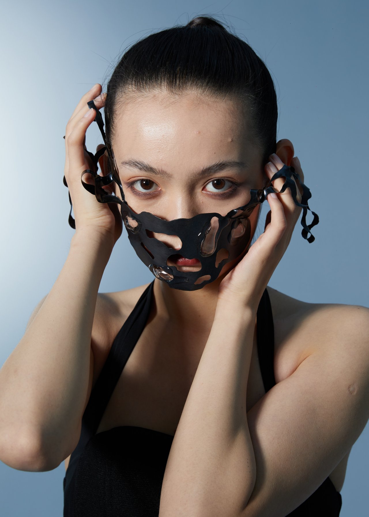 在作品《窒息感》中,以海牛因為海藻的泛濫而缺氧為靈感,我嘗試加入了有關(guān)海藻本身的材料去融入作品,比如海藻酸鈉。作品都是圍繞著面部去展開。因為環(huán)境和海洋的污染本質(zhì)上人為因素占比更多,所以我想讓佩戴者感同身受海牛的處境。作品利用泡泡膠這一材料,結(jié)合封固在人面部的網(wǎng)狀框架,讓人們從視覺感受到想呼吸卻被外面的框架給阻擋住的痛苦。將金屬氧化成黑色,既想從視覺上讓佩戴者感受到缺氧帶來的痛苦,并且能突出海洋生物在海洋中的絕望。
