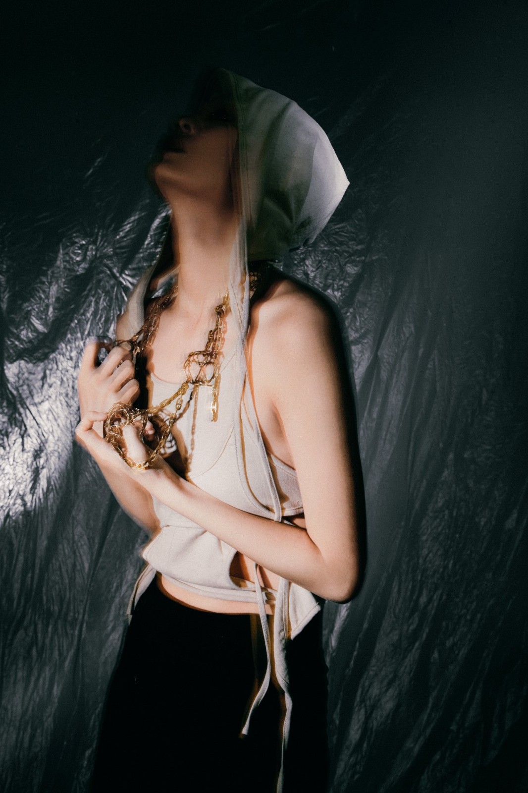 《鈴鼓》是一系列能隨著人體的運動而發出聲音的首飾。首飾和音樂有相似之處,都可以提高人們的精神滿足感和舒適感。受到中國傳統配飾步搖和禁步的啟發,當人佩戴它們行走時,配飾上的金玉相互碰撞會發出令人愉悅的聲音。于是我想通過人們不同的行為來探索人與首飾對象之間的關系,這可能會給觀眾帶來更有趣的穿著體驗和一種獨特的心理感受。
