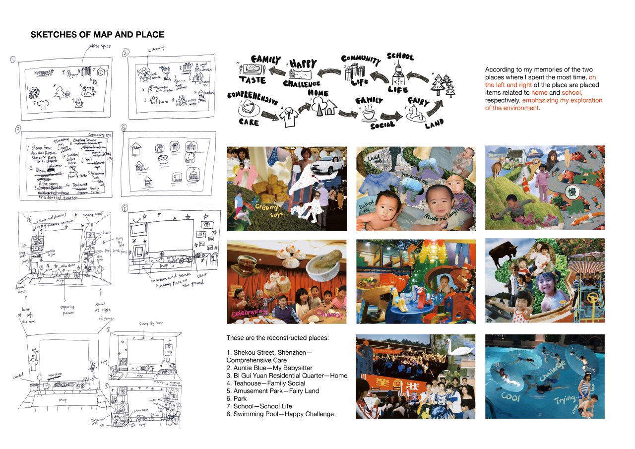 The project <Autumn in Chestnuts> is inspired by the specialness of chestnuts to me, it holds memories and longings for me, so I developed associations with autumn through its taste, in terms of memory, touch and nature. I chose the package of roasted chestnuts to demonstrate the association with autumn. For example, in the touch of wood, I used velvet and linen, to allow the viewer to touch the texture of the wood. Aided by the arrangement of images and mixed materials to create new feelings, it is presented as a book, inviting the audience into the autumn in my world. In <My Attachment Place>, I investigated theories of place attachment by reviewing childhood memories, focusing on the relationship between contact with caregivers and exploration of my surroundings to explain my place attachment. I experimented with the video format to narrate the connection between my upbringing and place through an interactive performance with spatial installation, collages and monologues. <The Poetic Boxes> installation starts from my crush experience and combines literary and visual expressions of personal emotions around profound feelings. I created five poems and used mixed media to create boxes that the audience can open on their own and discover the emotions hidden in the corners of these boxes.