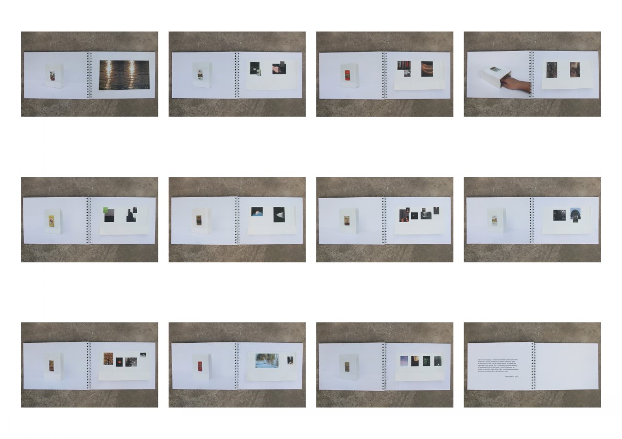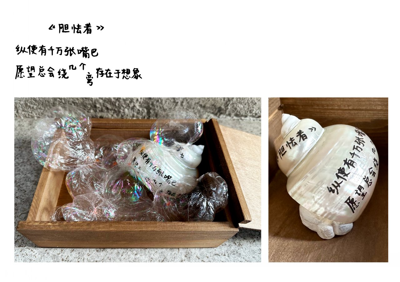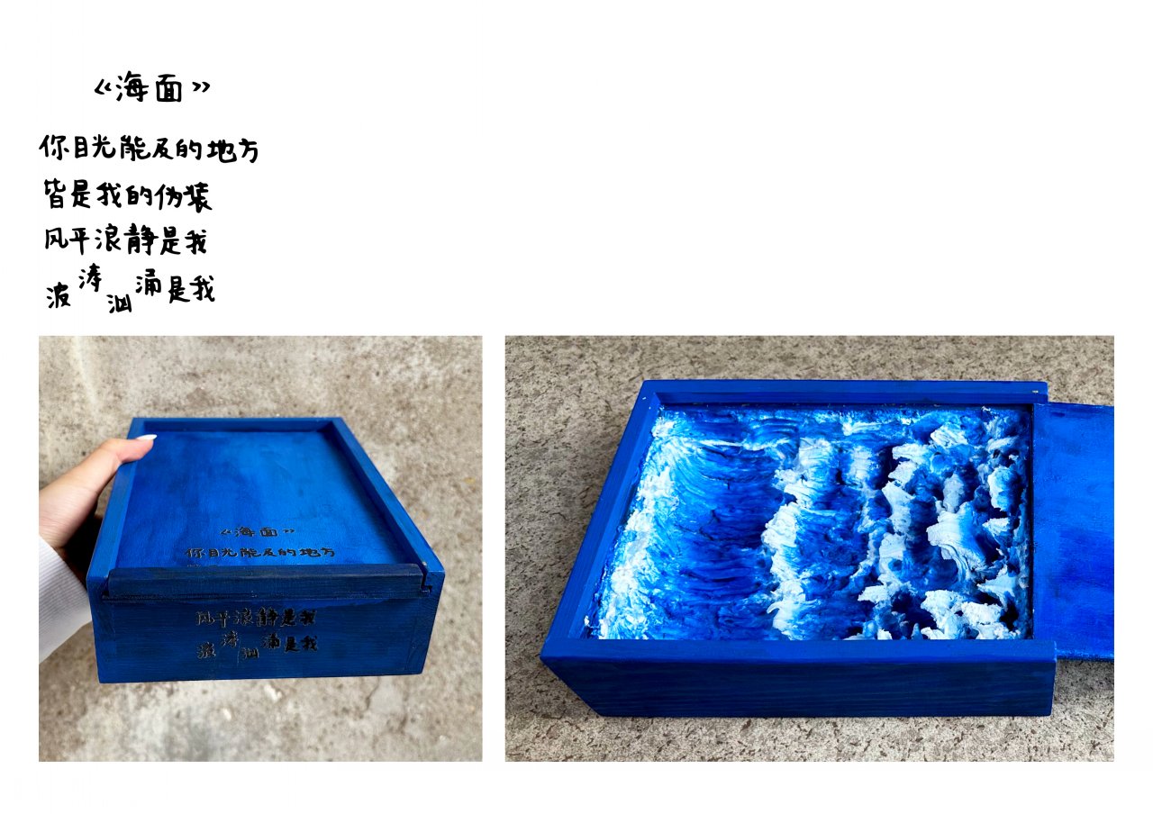 《栗的秋》靈感來源于栗子對我的特殊性,它對我來說有著回憶和憧憬,所以我通過它的味道,從記憶、觸覺、自然等方面展開對秋天的聯(lián)想。我選用了糖炒栗子的包裝袋并在每個(gè)袋子裝進(jìn)我的聯(lián)想。比如其中一個(gè)重點(diǎn)是秋天木頭的觸感,我用天鵝絨和亞麻面料,讓觀眾能夠觸摸到木頭的質(zhì)感。該作品采用圖片的排列方式及綜合材料輔佐來創(chuàng)造新的感覺,最終以書的方式呈現(xiàn),邀請觀眾進(jìn)入我的世界的秋天。在《我的依戀所在》中,我從回顧童年記憶中研究地方依戀的理論,將重點(diǎn)放在與照顧者的接觸和對周圍環(huán)境的探索之間的關(guān)系來解釋我的地方依戀。我嘗試了視頻形式,通過與空間裝置的互動表演,拼貼的畫面和獨(dú)白,敘述我的成長和地方之間的聯(lián)系。《暗盒》裝置由我的暗戀經(jīng)歷出發(fā),圍繞深刻的感受,結(jié)合了文學(xué)和視覺表達(dá)個(gè)人情感。我創(chuàng)作了五首詩,用綜合材料來制作盒子,讓觀眾自主打開并發(fā)現(xiàn)藏在盒子各個(gè)角落的暗戀情愫。