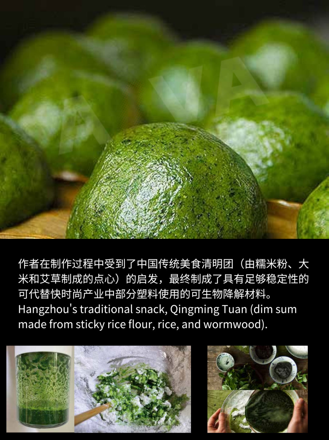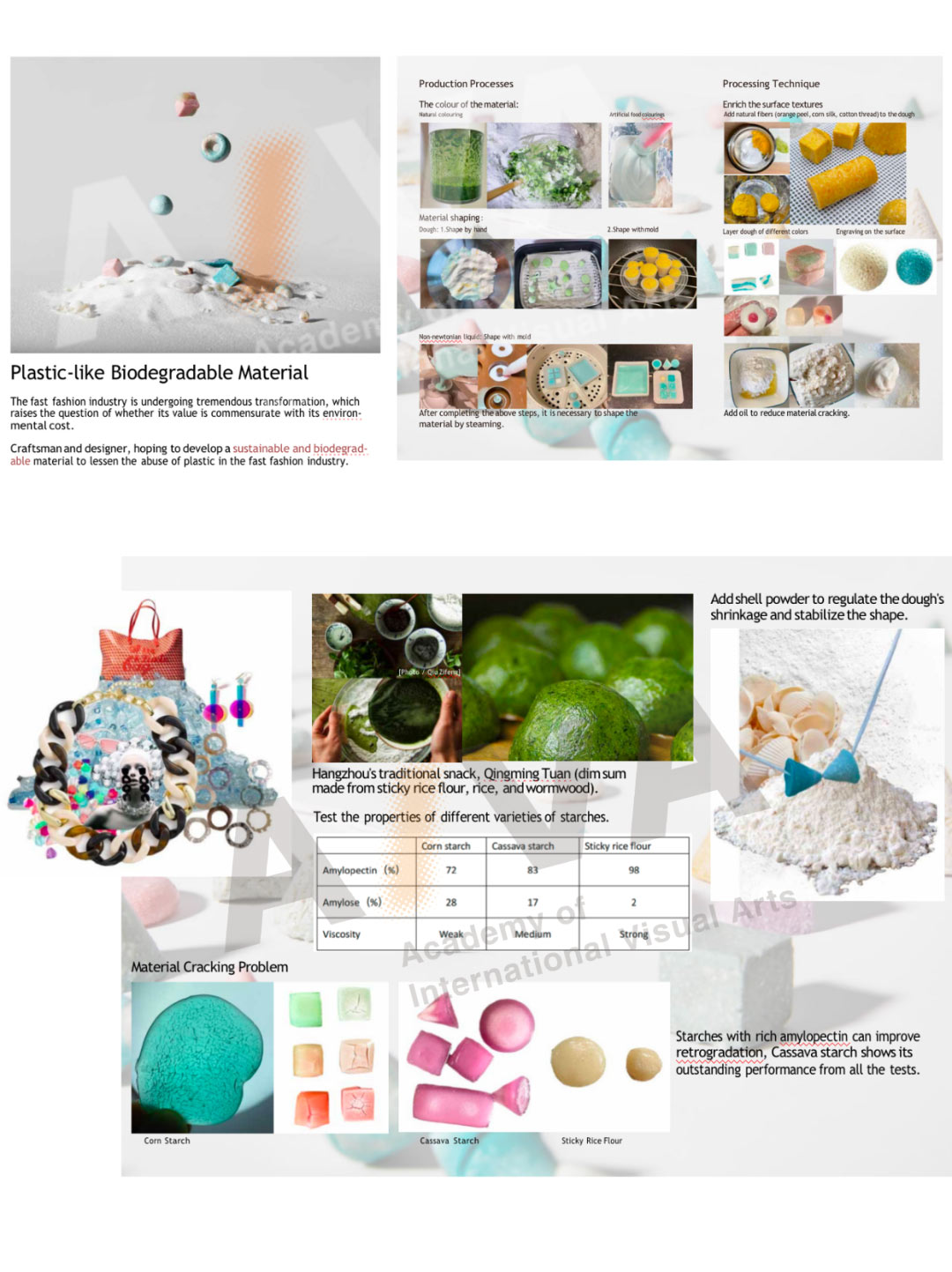 “我想做這個項目是基于現在快時尚產業產生的環境污染和資源浪費。但是,由于目前限制快時尚產業發展是不太現實的,所以我想從我們配飾材料的角度出發來制作一些可降解的材料?!?/p>