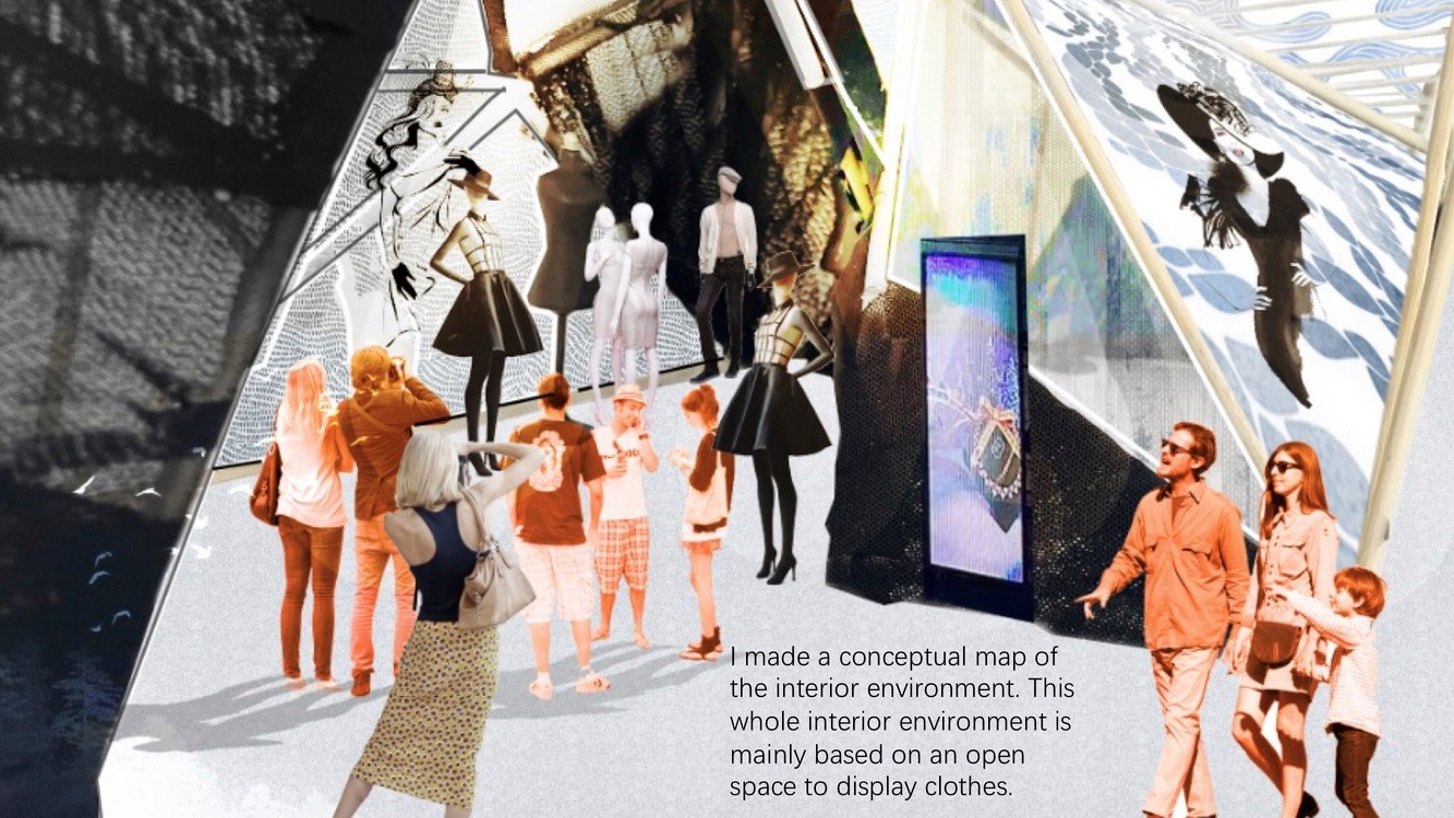 《A sense of distance and belonging》是我為Prada設計的一個快閃店。在建筑整體的構建上我參考了Prada服飾的一些廓形和剪裁,運用棱角分明的線條和大量的三角體確立了建筑的造型基礎,并決定用Prada標志性的尼龍面料作為建筑的墻體。同時我將這個建筑設計為半開發的結構,透明玻璃與實體墻形成對比,聯系了一部分的內外空間,也為使觀眾帶來輕松的氛圍。而尼龍布則會將部分展陳內容遮擋,以此增加神秘感,吸引外部觀眾進入店內探索。