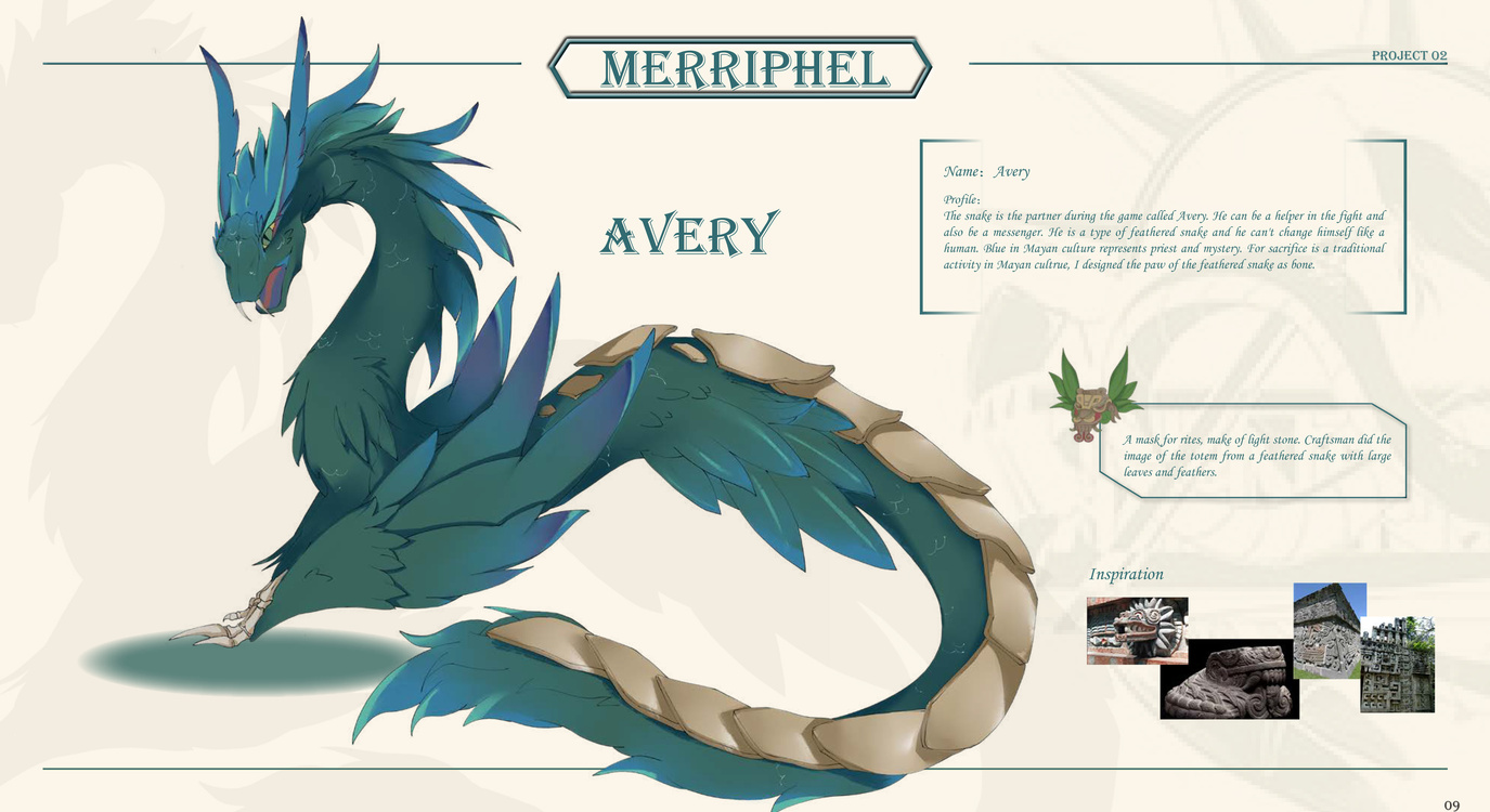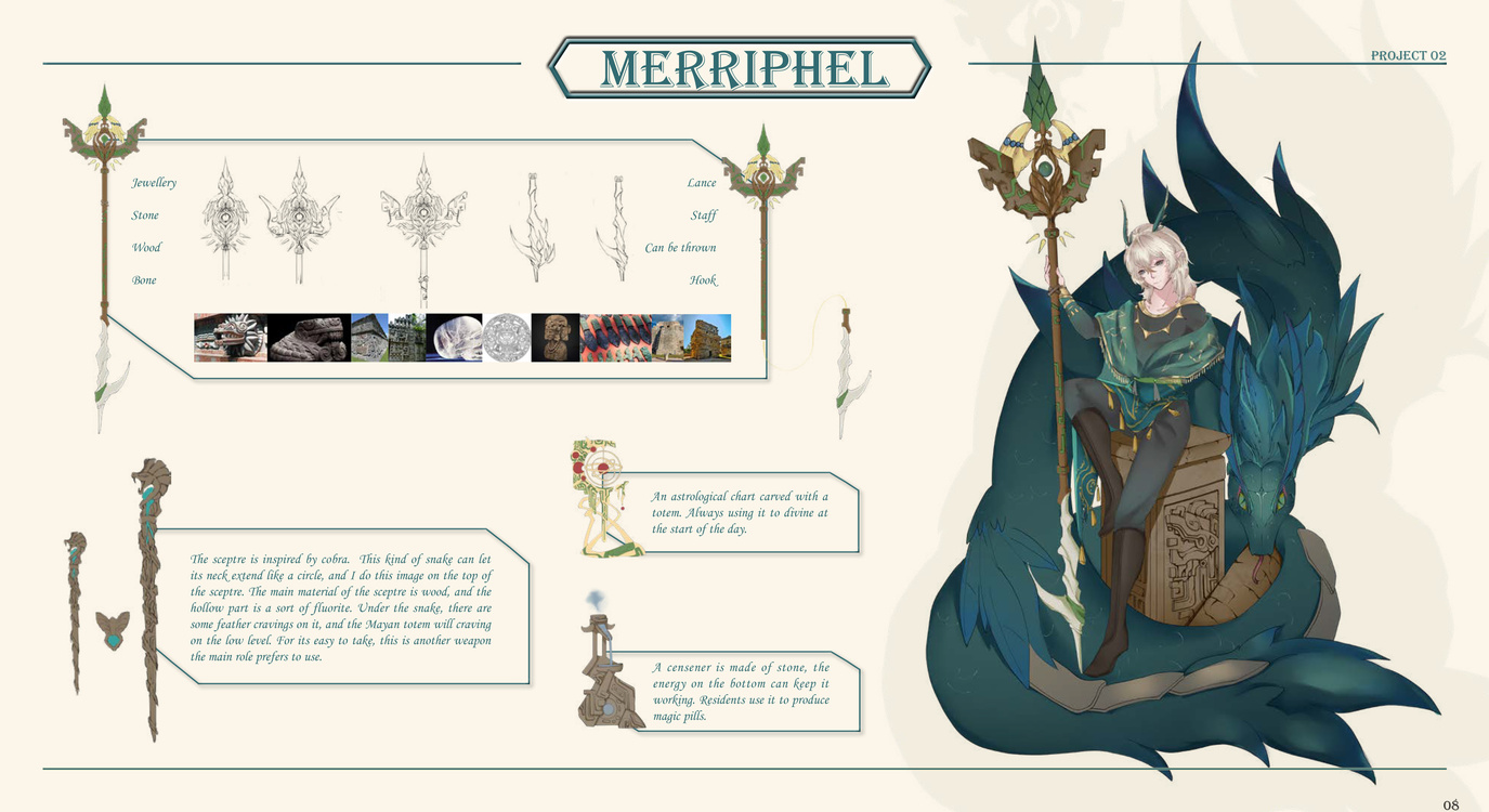 在《梅里斐爾》(Merriphel)設計中,我選用了瑪雅文化作為角色設計的背景。但其相關背景故事里,還融入了一些瑪雅的姐妹文化阿茲特克的元素。瑪雅與阿茲特克文化有很多相似而不同的特征,這能使我的設計過程有更多層次與發揮的空間。在這個項目里,為每個非玩家人物(NPC) 設計石制、木制、骨制等材料設計道具與物品,這些材質都是瑪雅祭祀里常見的材料。