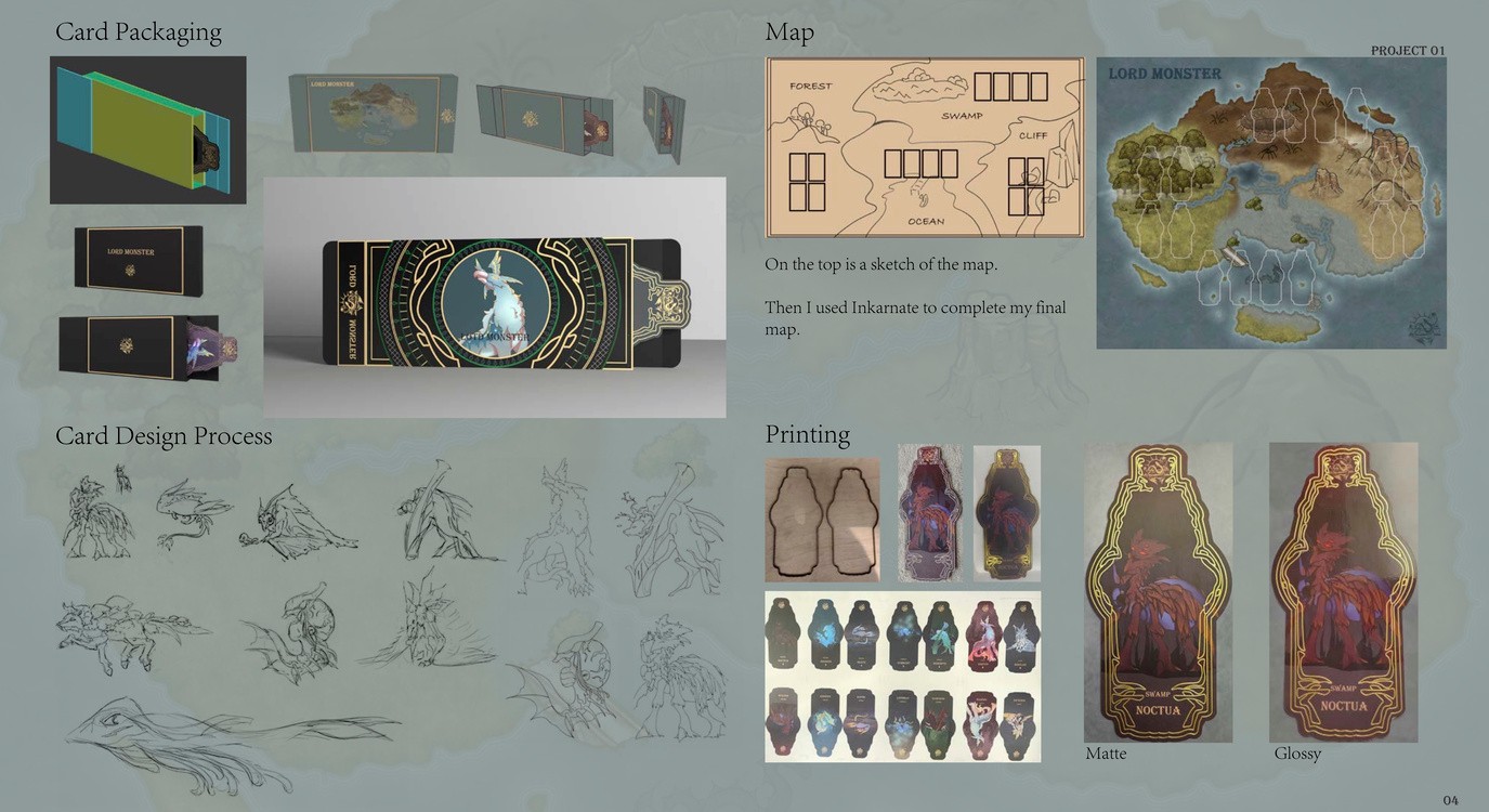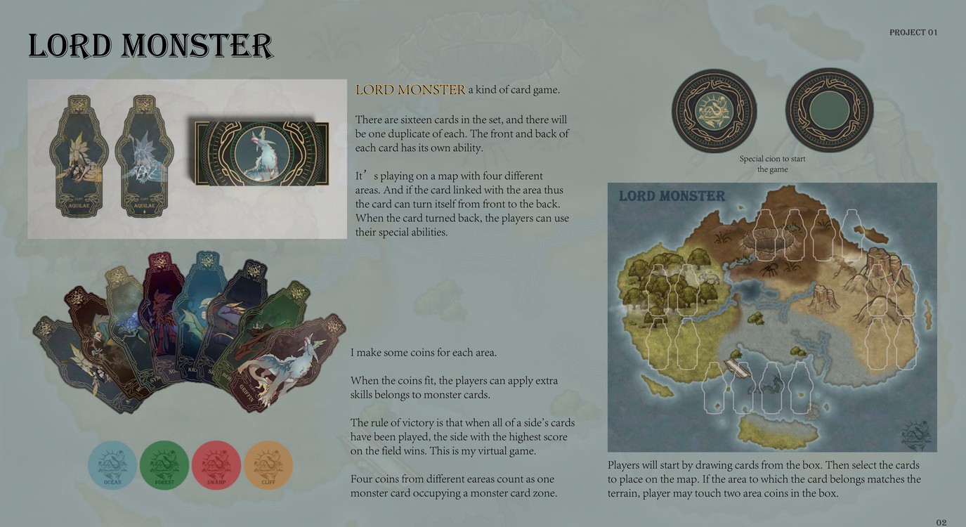 In another card game design project Lord Monster, my inspiration comes from a mishmash of myths and legends. These include Japanese folklore, the ancient Chinese geographical work The Classic of Mountains and Seas, and the monstrous creatures of Norse mythology. I’m passionate about combining elements of completely different creatures and designing their habits and habitats with unique story backgrounds. Many conceptual artists have already explored various designs in the past, so creating an independent world with new creatures presents an exciting challenge for me. Furthermore, I designed different characteristics and play styles for the front and back of each card, allowing players to learn more about the creature’s habits and story through gameplay. Additionally, I designed the maps to have gameplay that can trigger regional interactions with the cards, providing a more immersive experience for players who are interested.