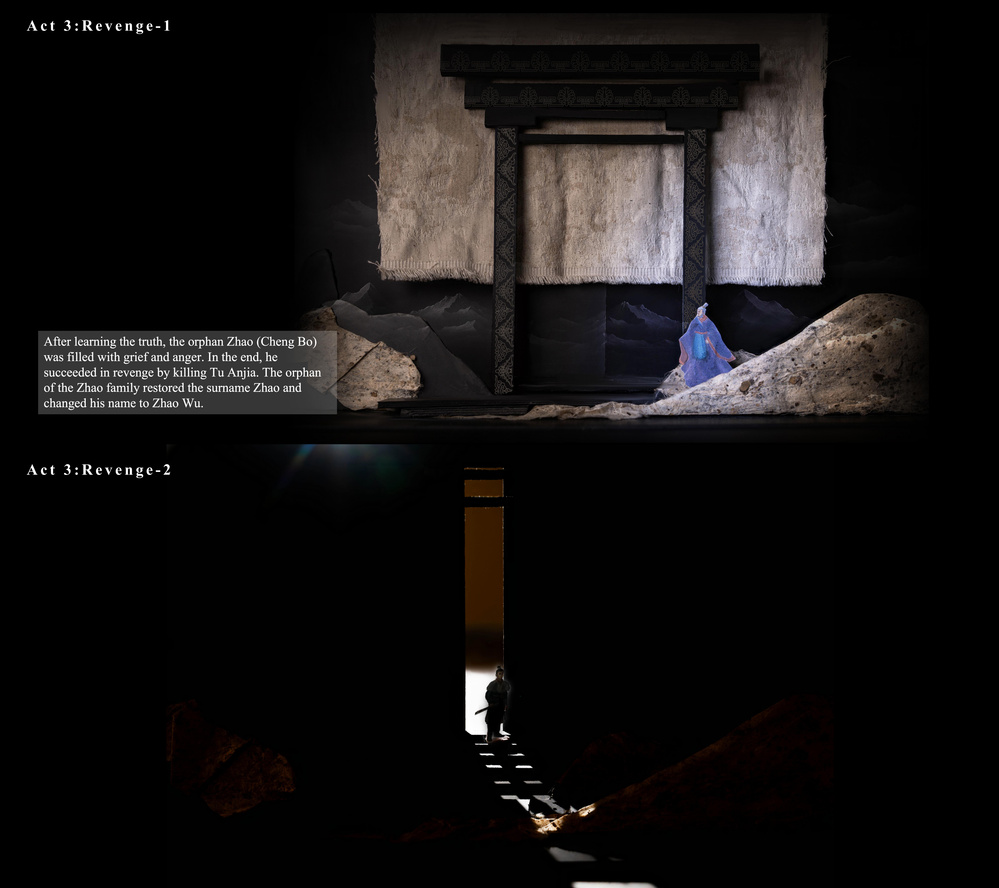 Orphan of Zhao marks the culmination of my learning experience. I enhanced the stage effects through projections and lighting, intensifying the tragic atmosphere. This traditional Chinese drama explores themes of loyalty, sacrifice, and justice, depicting a prolonged struggle against evil. The forces of justice, represented by the protagonist, exact a painful toll in their pursuit of revenge.