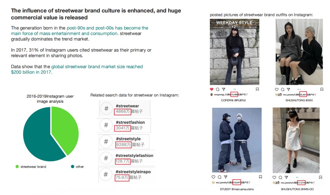 我的第三個項目靈感來源于《2018中國城市時尚指數報告》中成都被評為與上海齊名的“中國時尚一線城市”的報告內容。所以我試圖在我的項目中探討研究成都成為中國潮流標簽的原因。從成都的基本地域情況,人民的作息習性、消費觀價值觀,以及成都潮牌文化的發展去分析研究成因。為此,我進入上海時裝周實習了兩周的時間,研究成都服裝零售市場的市場推動因素是什么?成都電子商貿業務興旺的原因?成都市場如何劃分的更細致了以及成都多品牌營運的方式?最后,我從發展和趨勢兩方面總結了成都潮流市場的未來走向。
