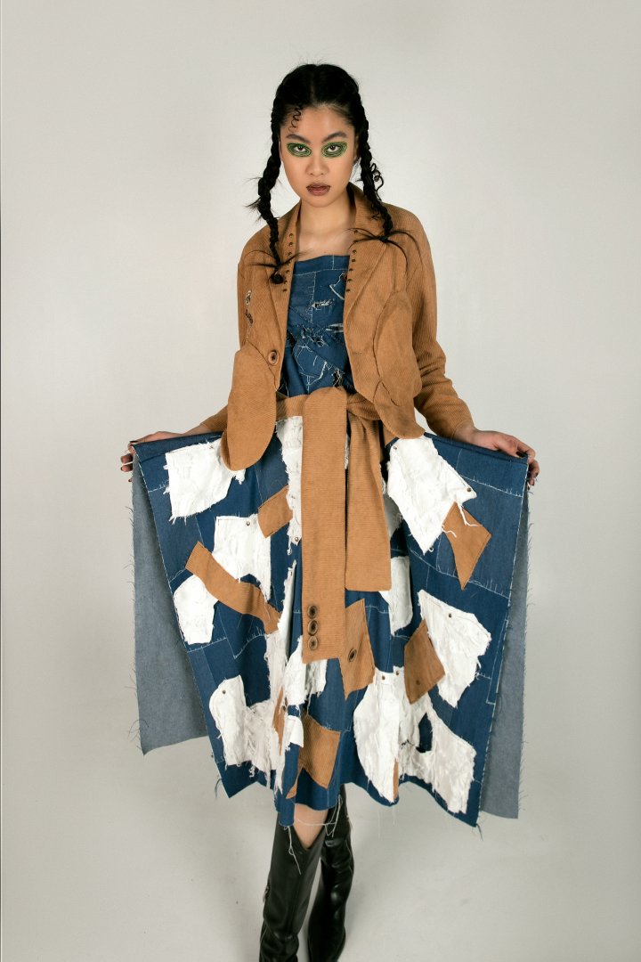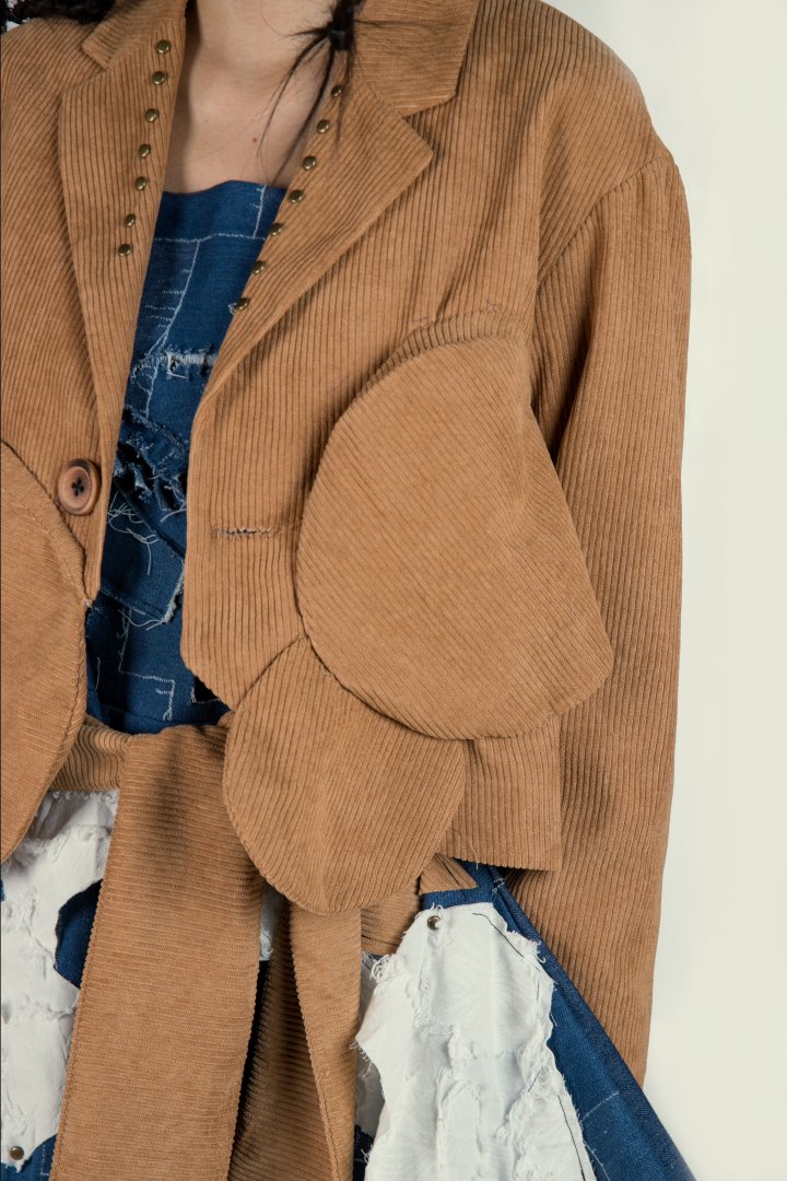 I focus on balancing the sense of design with wearability when designing garments, and I love finding inspiration from past fashion, which is reflected in my project "TIMES". The collection drew inspiration from the black-and-white film "Modern Times," which portrays the struggling working-class life in the United States during the Great Depression in dark humor. I researched typical Americans wearing in the 1930s, extracting some popular fashion element at the time, such as H line dress, as well as the neat and tidy suits of the capitalists in the movies and the tattered oil-stained aprons and denim jumpsuits of the working class. I also combined the screws, buttons, gears and other elements that appeared in the movie to make fabric manipulation samples. I slightly burned some gears, screws and buttons using a flame gun, trying to create a retro yet modern casual style.